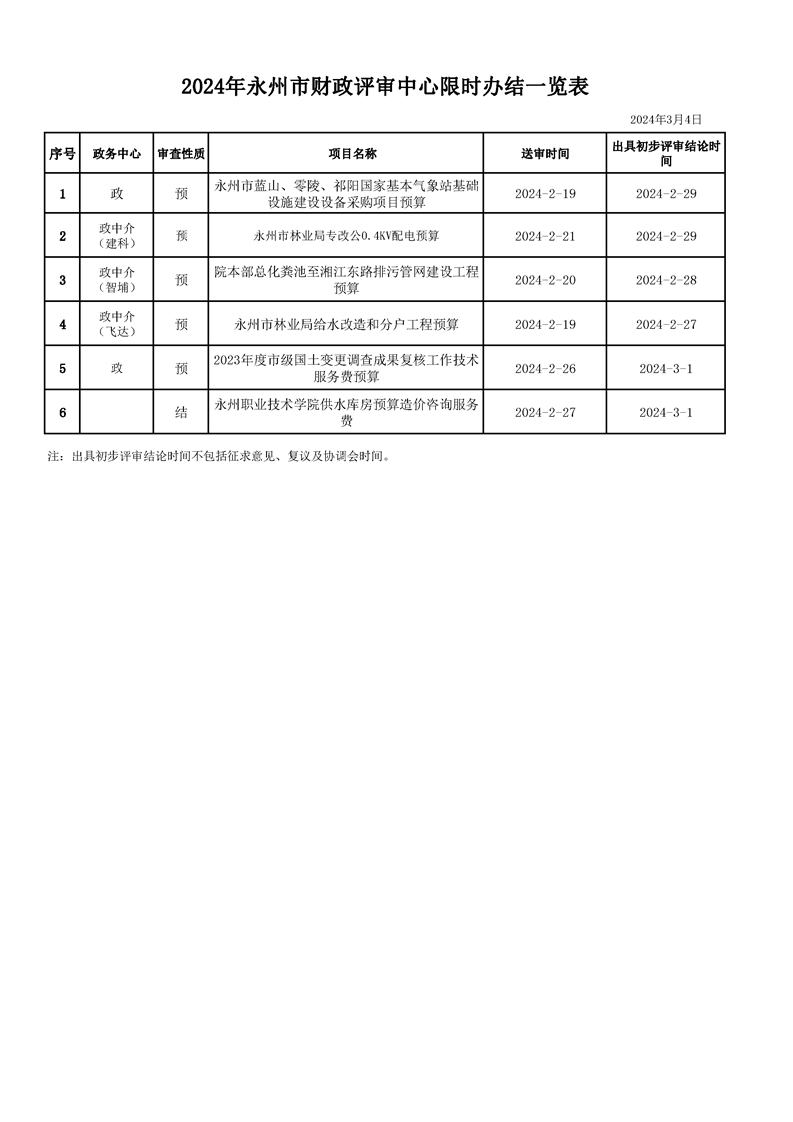2024年永州市财政评审中心限时办结一览表(2024年3月4日)