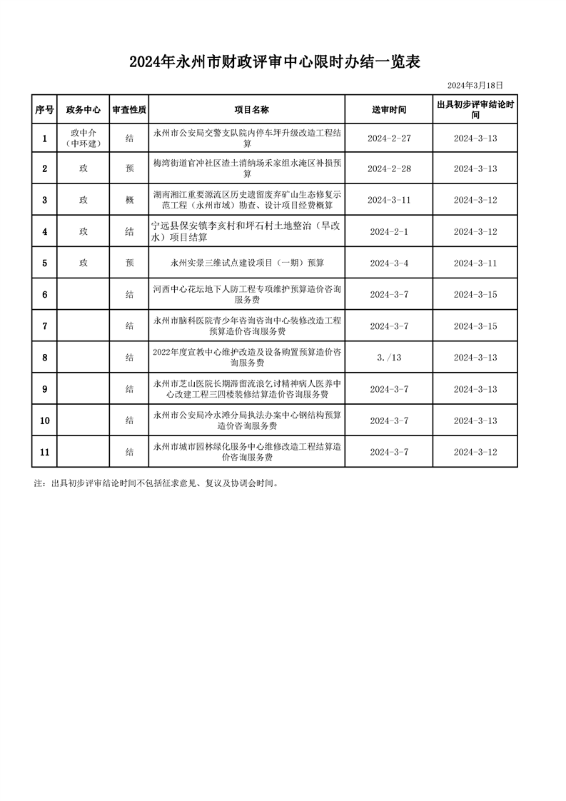 2024年永州市财政评审中心限时办结一览表(2024年3月18日)