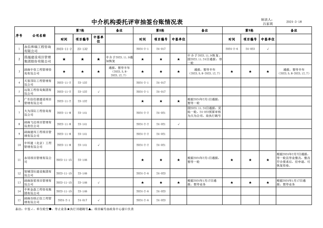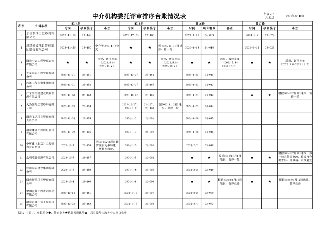 中介机构委托评审台账情况表(2024年3月18日)