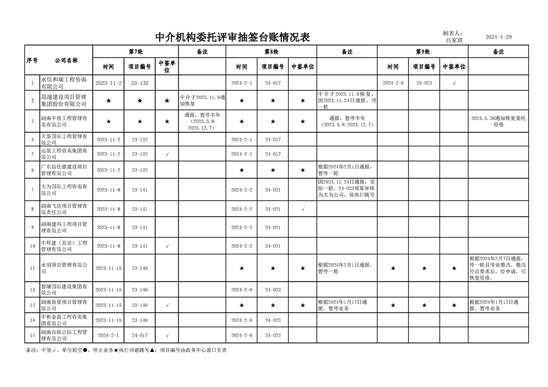 中介机构委托评审台账情况表(2024年4月29日)