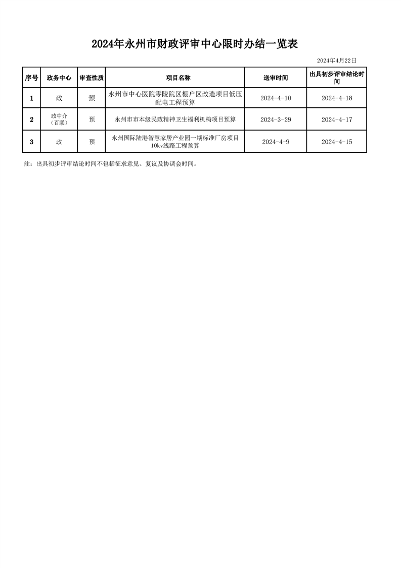 2024年永州市财政评审中心限时办结一览表(2024年4月22日)