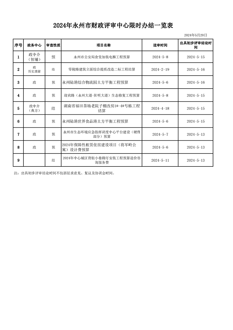 2024年永州市财政评审中心限时办结一览表(2024年5月20日)