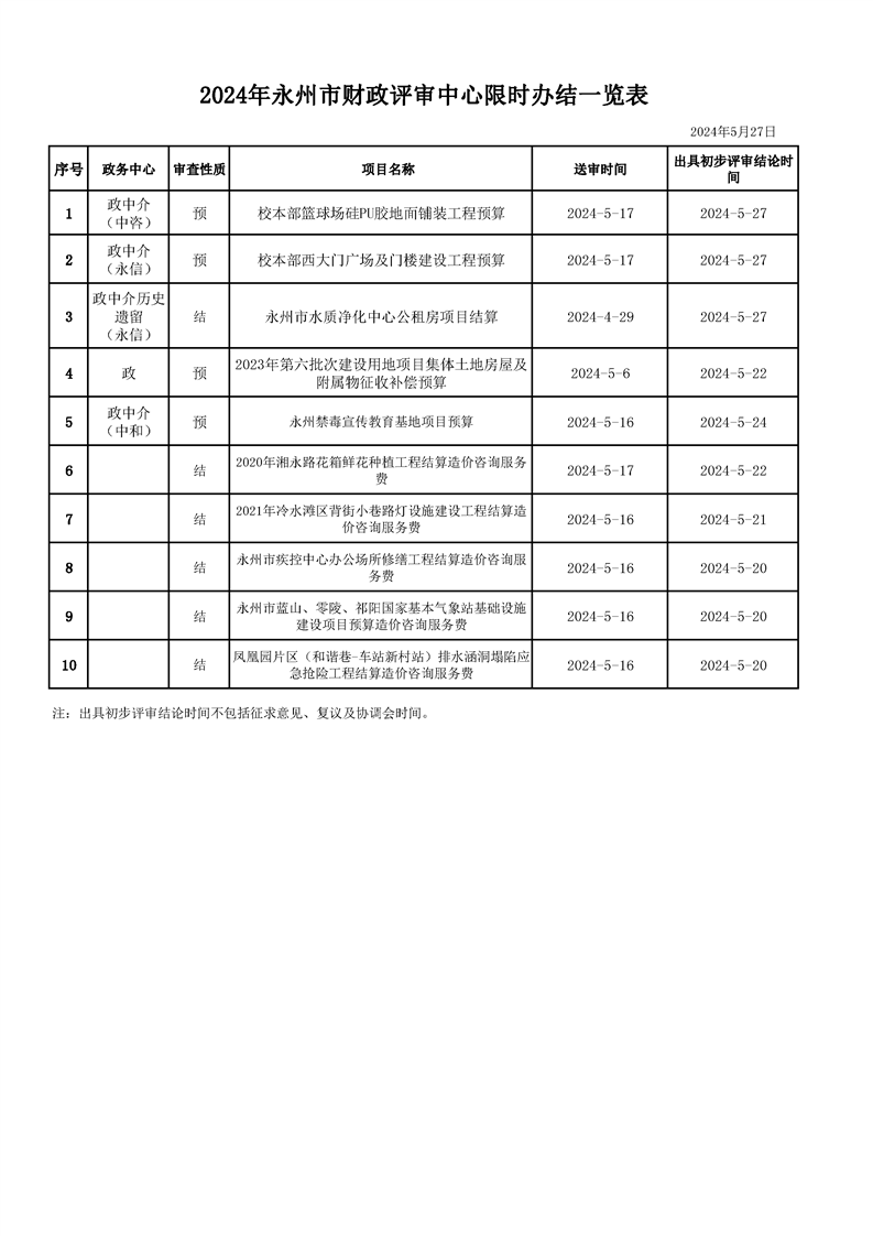 2024年永州市财政评审中心限时办结一览表(2024年5月27日)