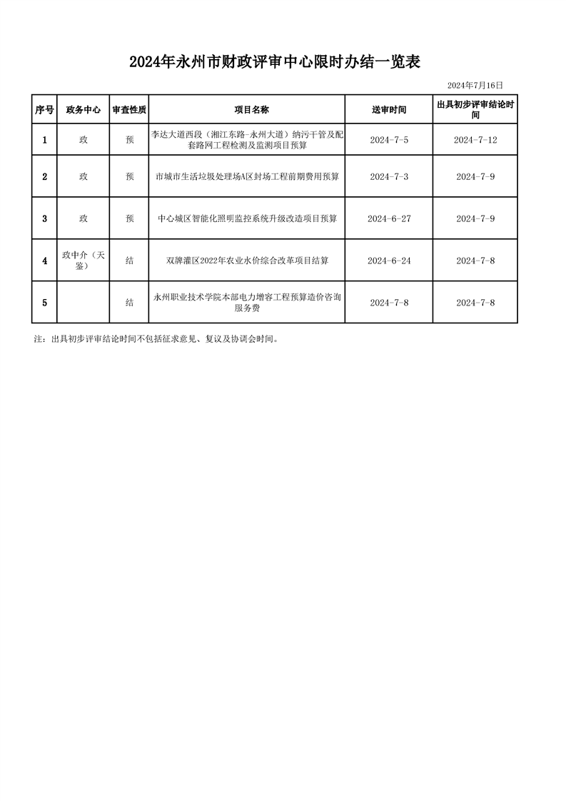2024年永州市财政评审中心限时办结一览表(2024年7月16日)