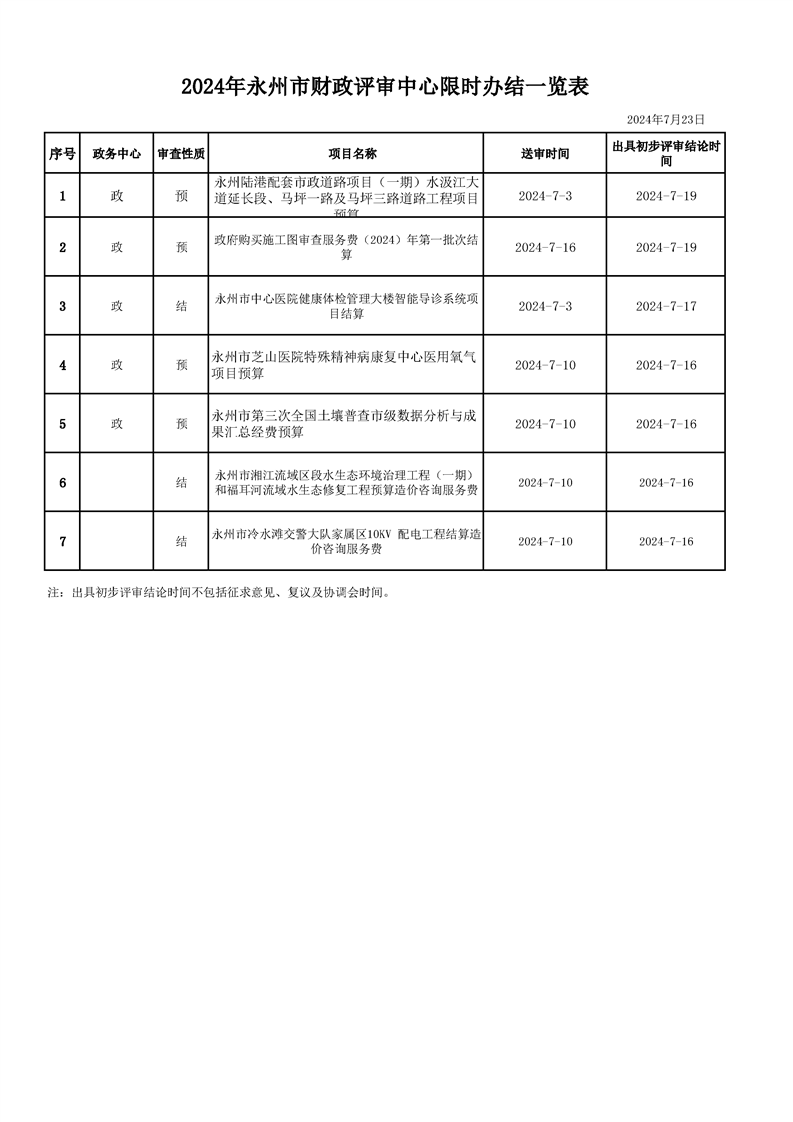 2024年永州市财政评审中心限时办结一览表(2024年7月23日)