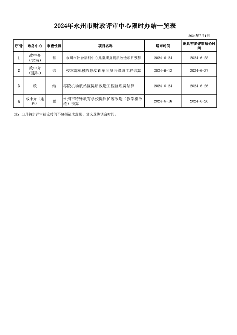 2024年永州市财政评审中心限时办结一览表(2024年7月1日)