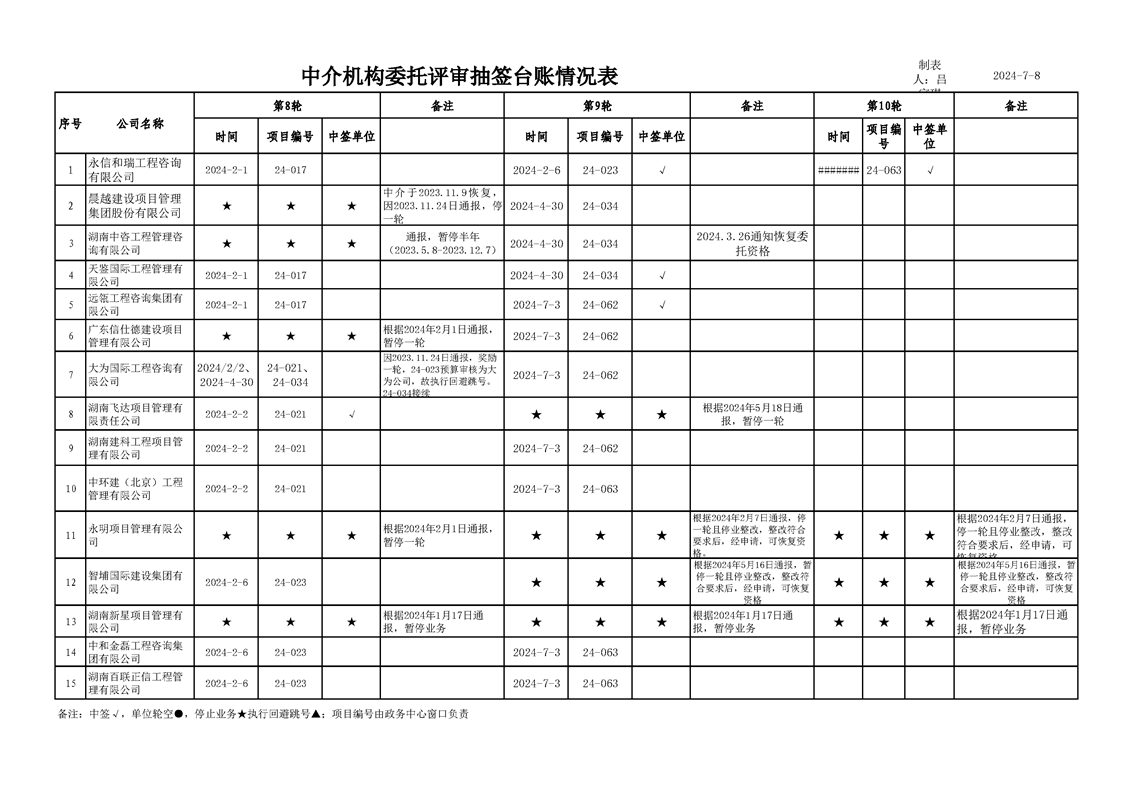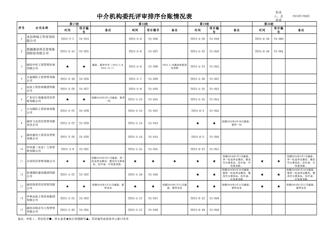 中介机构委托评审台账情况表(2024年7月8日)