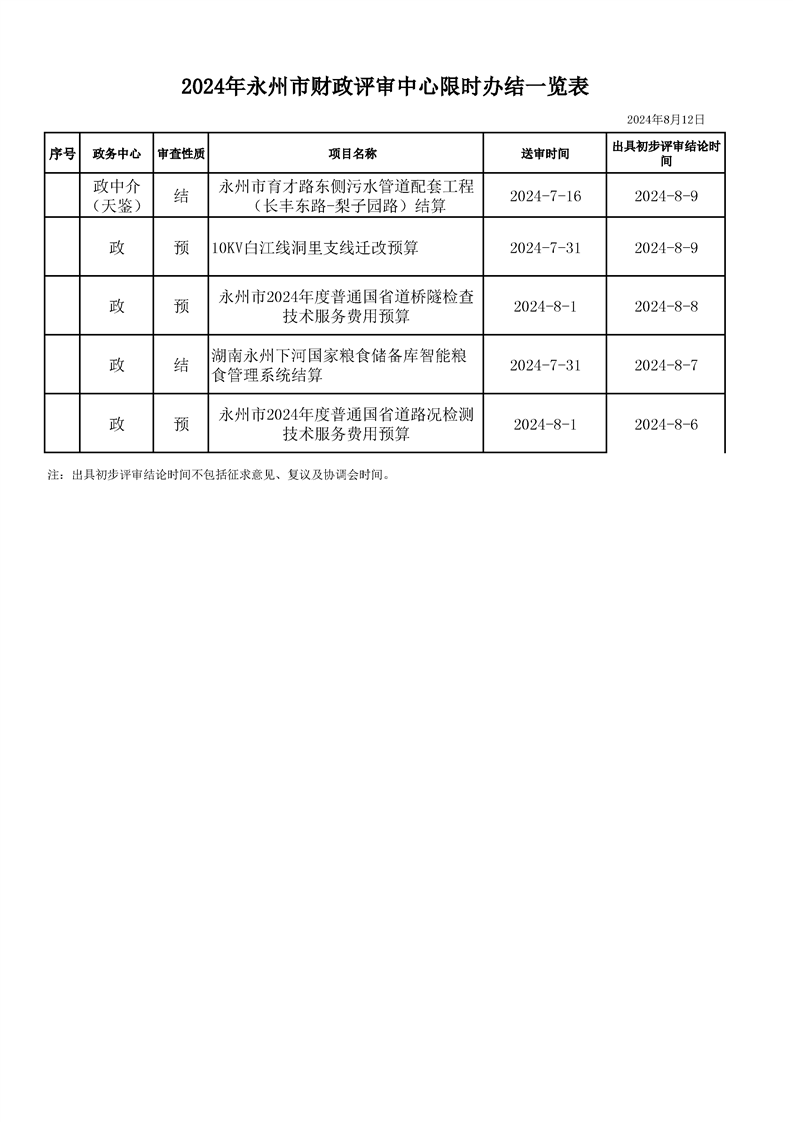 2024年永州市财政评审中心限时办结一览表(2024年8月12日)