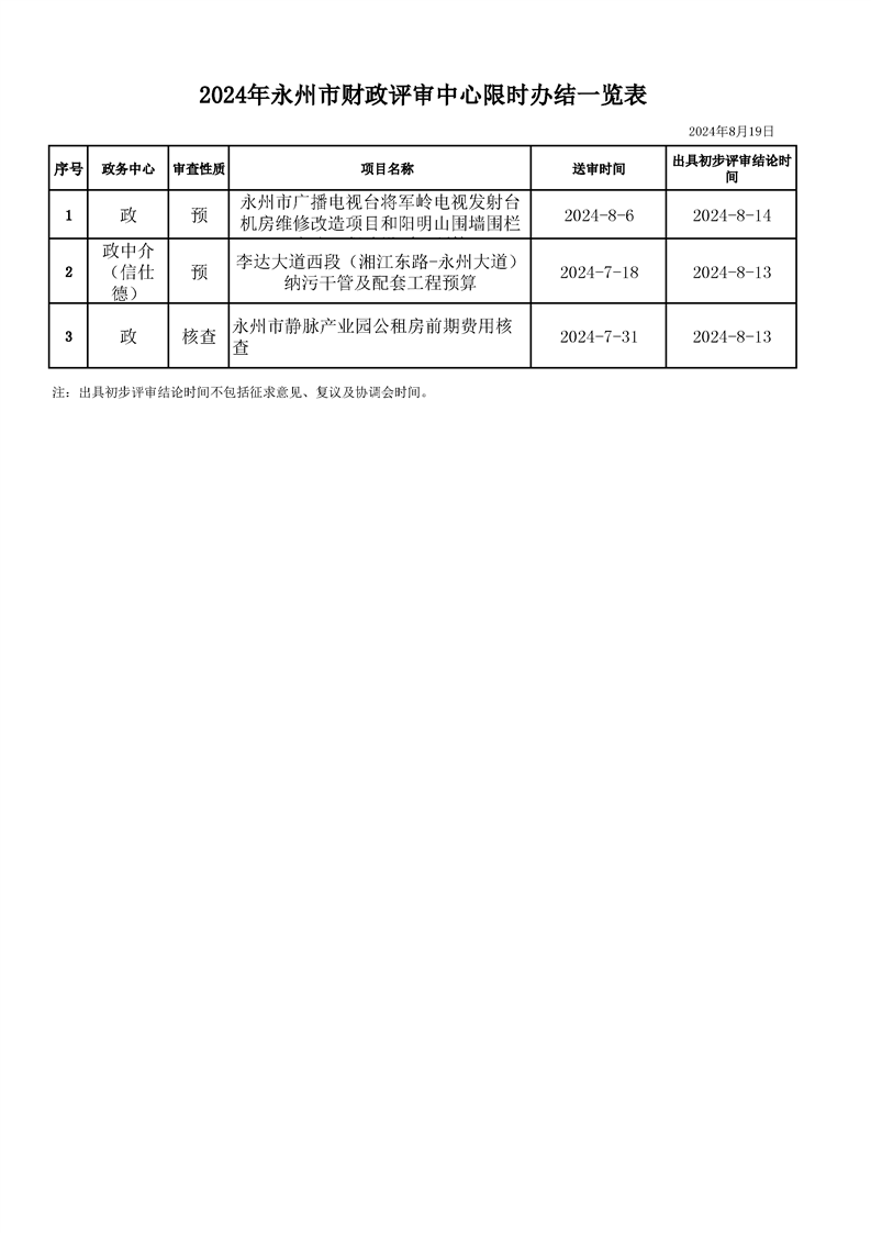 2024年永州市财政评审中心限时办结一览表(2024年8月19日)