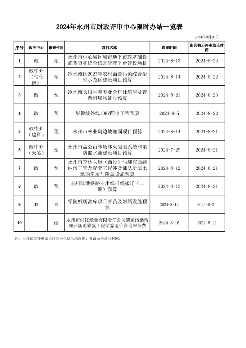 2024年永州市财政评审中心限时办结一览表(2024年8月26日)