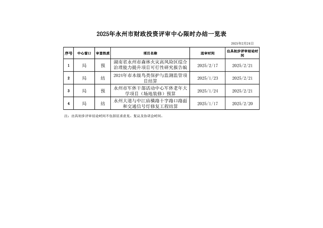 2025年永州市财政投资评审中心限时办结一览表(2025年2月24日)