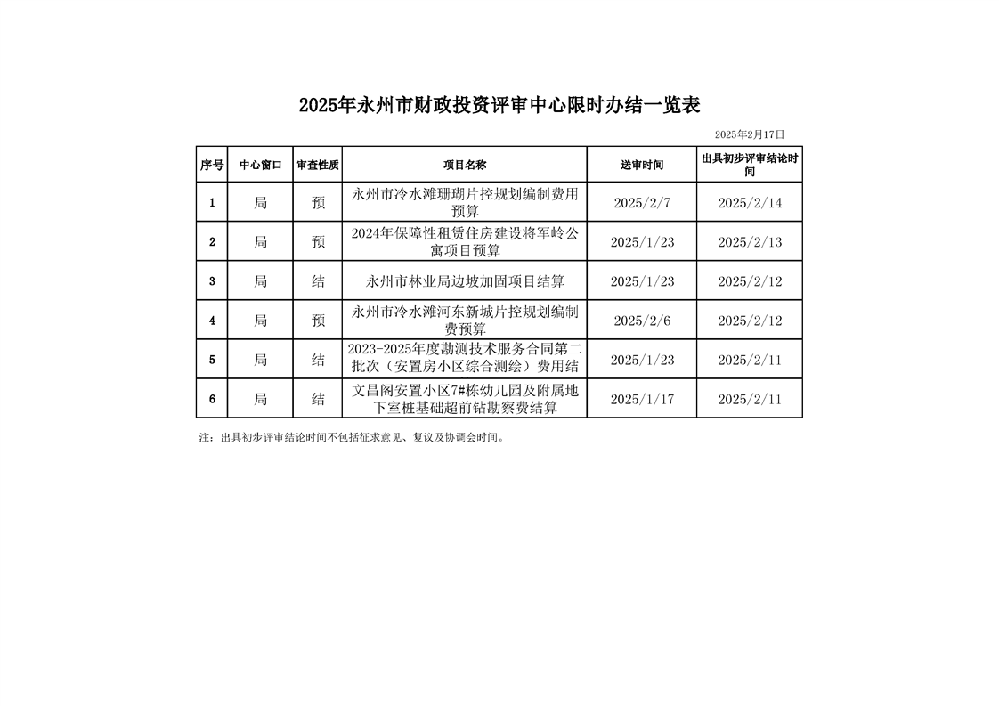 2025年永州市财政投资评审中心限时办结一览表(2025年2月17日)