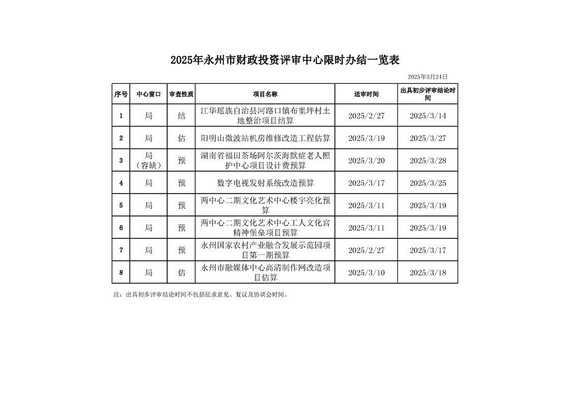 2025年永州市财政投资评审中心限时办结一览表(2025年3月24日)