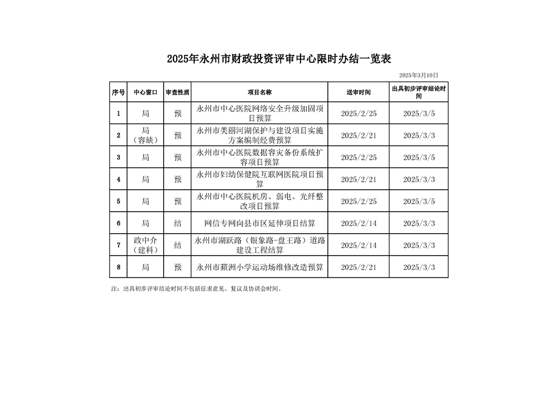 2025年永州市财政投资评审中心限时办结一览表(2025年3月10日)
