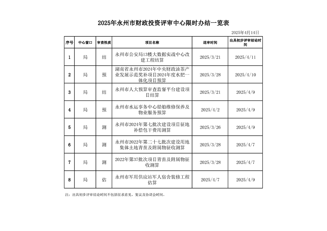 2025年永州市财政投资评审中心限时办结一览表(2025年4月14日)