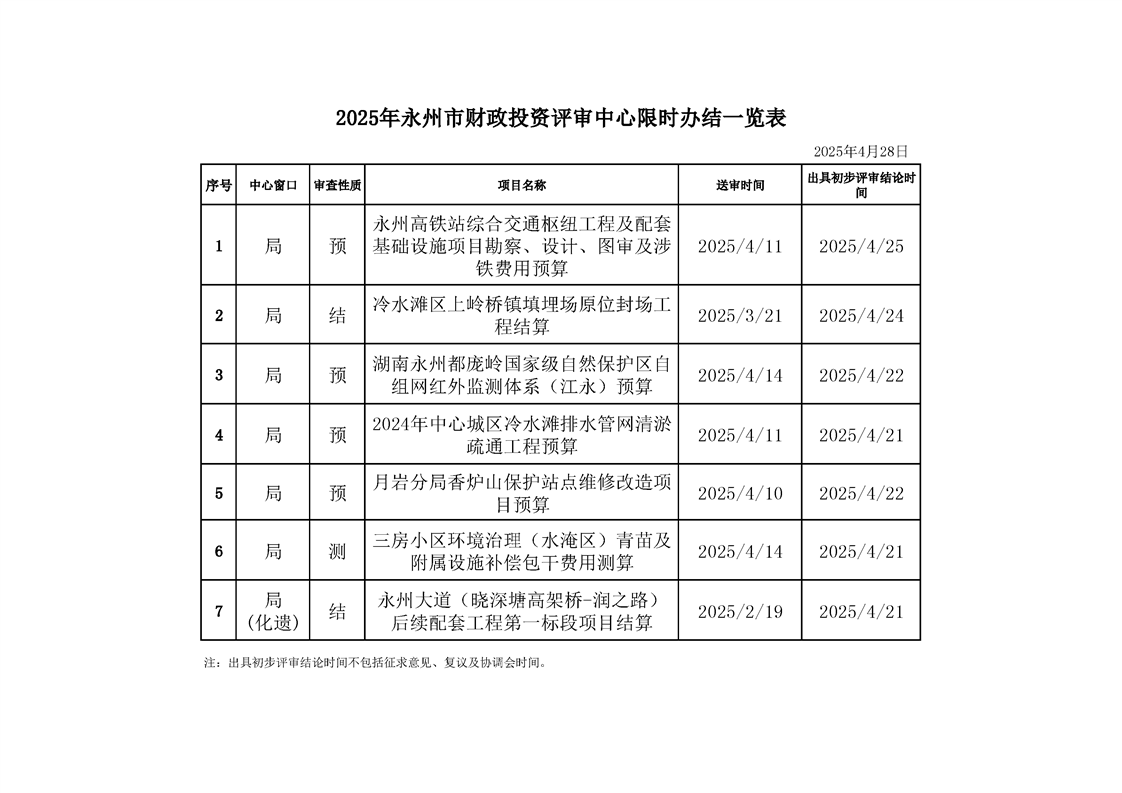 2025年永州市财政投资评审中心限时办结一览表(2025年4月28日)