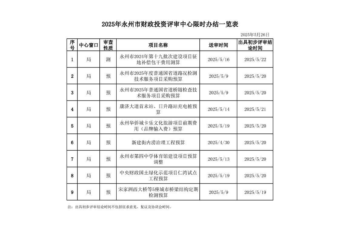 2025年永州市财政投资评审中心限时办结一览表(2025年5月26日)