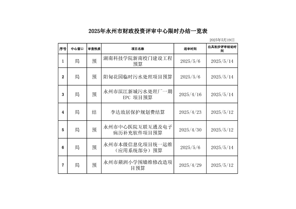 2025年永州市财政投资评审中心限时办结一览表(2025年5月19日)