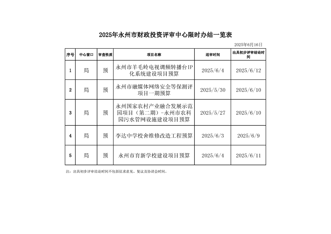 2025年永州市财政投资评审中心限时办结一览表(2025年6月16日)