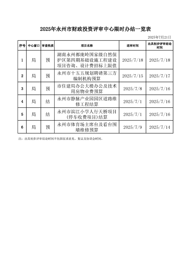 2025年永州市财政投资评审中心限时办结一览表(2025年7月21日)