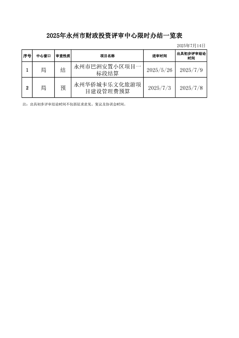 2025年永州市财政投资评审中心限时办结一览表(2025年7月14日)
