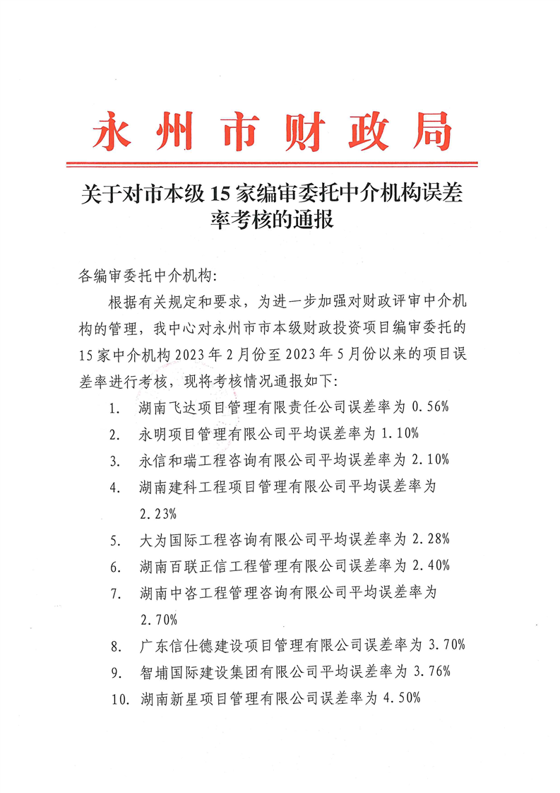 关于对市本级15家编审委托中介机构误差率考核的通报