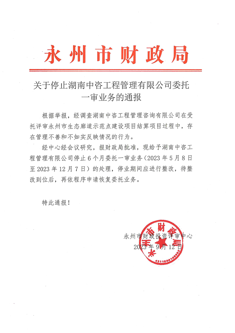 关于停止湖南中咨工程管理有限公司委托一审业务的通报