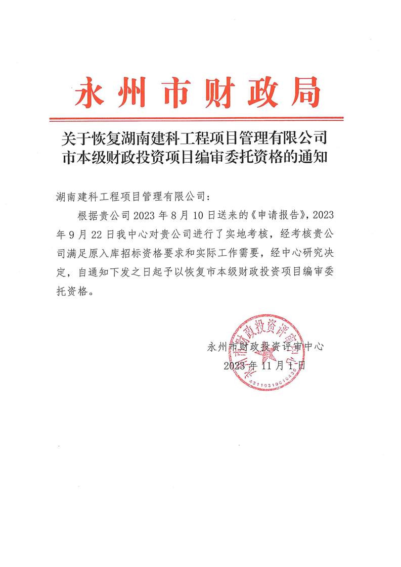 关于恢复湖南建科工程项目管理有限公司市本级财政投资项目编审委托资格的通知