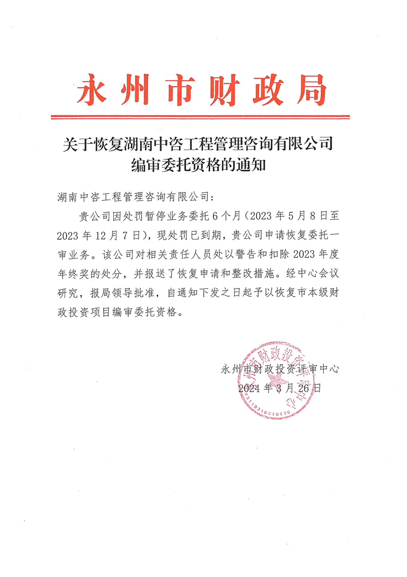 关于恢复湖南中咨工程管理咨询有限公司编审委托资格的通知