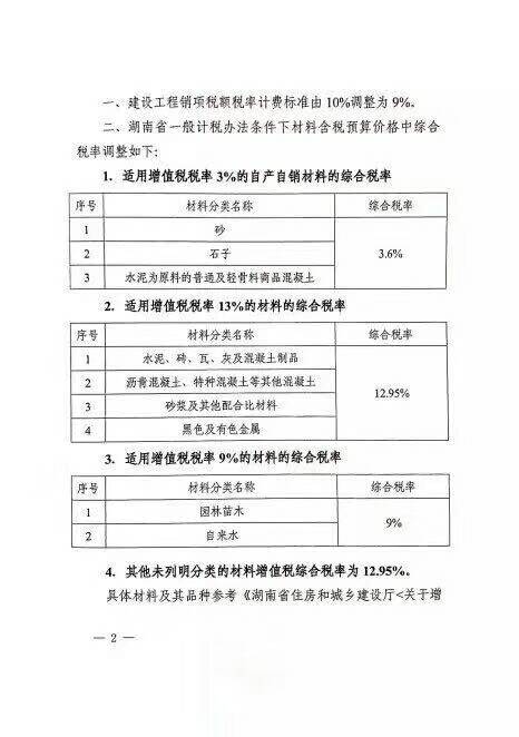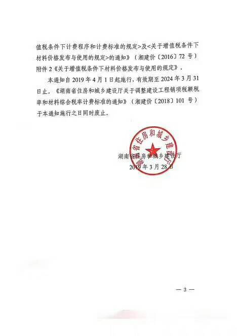 湖南省住房和城乡建设厅关于调整建设工程销项税额税率和材料价格综合税率计费标准的通知(湘建价[2019]47号)