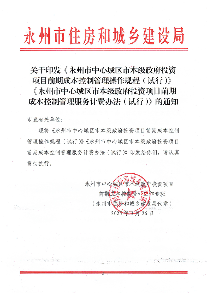 永州市住房和城乡建设局关于印发《永州市中心城区市本级政府投资项目前期成本控制管理操作规程(试行)》《永州市中心城区市本级政府投资项目前期成本控制管理服务计费办法(试行)》的通知