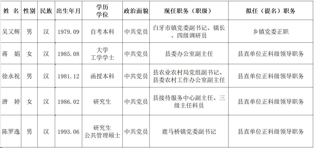 为了加强对干部选拔工作的监督,提高识别和任用干部的准确程度,现对县委常委会会议研究决定的下列5名拟任(提名)人选进行任前公示: