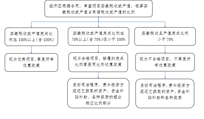 二十一退出机制招商项目建成投产(用地项目2年内投产,租赁厂房项目1年内投产重特大项目根据“一事一议”有合同约定的除外)后约定年度内实缴税收且产值没有达到合同约定数额的70%的视为不合格项目,启动项目退出机制由经开区根据税务部门提供的实缴税收证明或实缴税收关联的营业收入证明,对照合同进行审查审定后,责令投资方已获取的各种资产、资金补贴补助和各种奖励返还实缴税收或产值达到本合同约定数额的70%以上70%的但没有达到100%的,视为合格项目,可按履约完成比例享受优惠政策,由经开区根据税务部门提供的实缴税收证明或实缴税收关联的营业收入证明,对照合同进行审查审定后,责令投资方已经获取的各种资产、资金补贴补助和各种奖励中超过相应比例的部分返还。