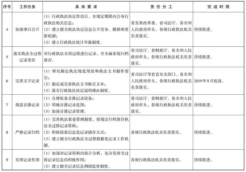 各地各部门要按照国办发〔2018〕118号文件和本实施方案的要求,加强对相关工作的督促检查,确保落到实处。各市州人民政府、省直各行政执法部门要于2019年6月底前制定本地区、本部门全面推行“三项制度”的实施方案,并报省司法厅备案。省司法厅要加强对全省全面推行“三项制度”的指导协调,会同有关部门进行监督检查和跟踪评估,重要情况及时报告省人民政府。