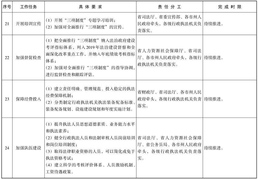 各市州、县市区人民政府要建立全面推行“三项制度”工作协调机制,研究解决全面推行“三项制度”工作中的重大问题。省直有关部门要把“三项制度”推进情况列入法治政府建设考评指标体系,列入2019年法治建设督察和全面深化改革重点工作,并纳入年底绩效考核指标体系。2019年7月底前,省司法厅要研究制定相关配套制度,明确全面推行“三项制度”工作的具体标准,相关配套制度报省人民政府批准后实施。省直各行政执法部门要加强对本系统全面推行“三项制度”工作的指导,及时研究解决本部门、本系统全面推行“三项制度”过程中遇到的问题,指导、督促下级部门严格规范实施“三项制度”。