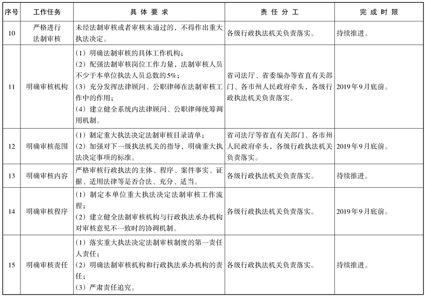 3.明确审核范围。各级行政执法机关要按照有关规定并结合实际,明确本机关纳入法制审核的重大执法决定事项范围,制定本机关重大执法决定法制审核目录清单。省级各行政执法部门要在2019年9月底前制定本机关重大执法决定法制审核目录清单,明确重大执法决定事项的标准,并指导市、县两级行政执法机关在2019年12月底前完成重大执法决定法制审核目录清单的编制工作。
