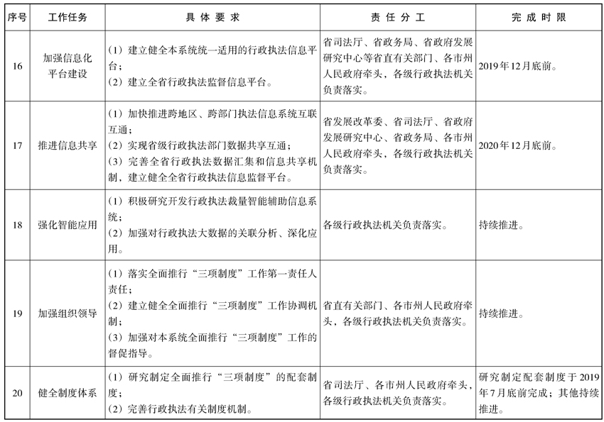 1.加强信息化平台建设。2019年12月底前,执法任务较多的省级行政执法部门要按照有关要求和标准,充分利用已有信息系统和数据资源,建立健全本系统统一适用的行政执法信息平台。实行综合行政执法改革试点的县市区、乡镇人民政府要建立健全适用于本地区的行政执法信息平台。省司法厅要建立以行政执法主体、人员信息、权责清单信息、办案信息、监督信息和统计分析信息等为主要内容的全省行政执法监督信息平台,并进一步完善全省行政执法数据汇集和信息共享机制,落实全国统一规范的执法数据标准,明确执法信息共享的种类、范围、流程和使用方式。