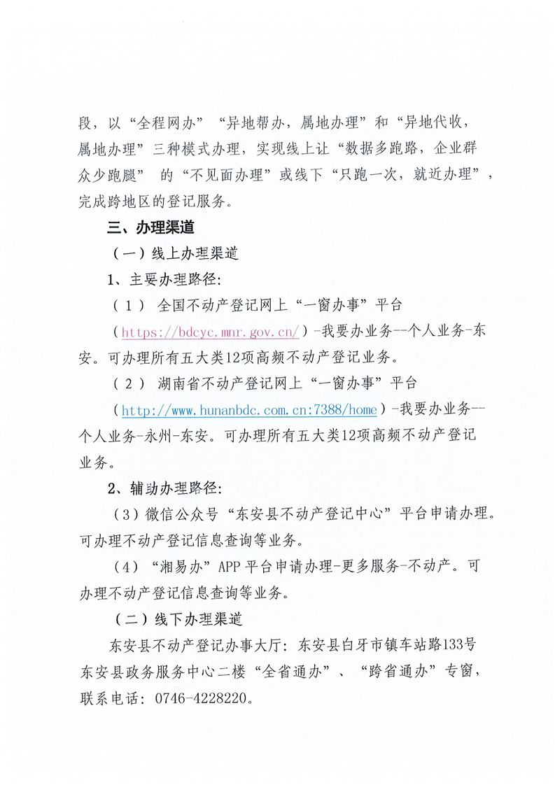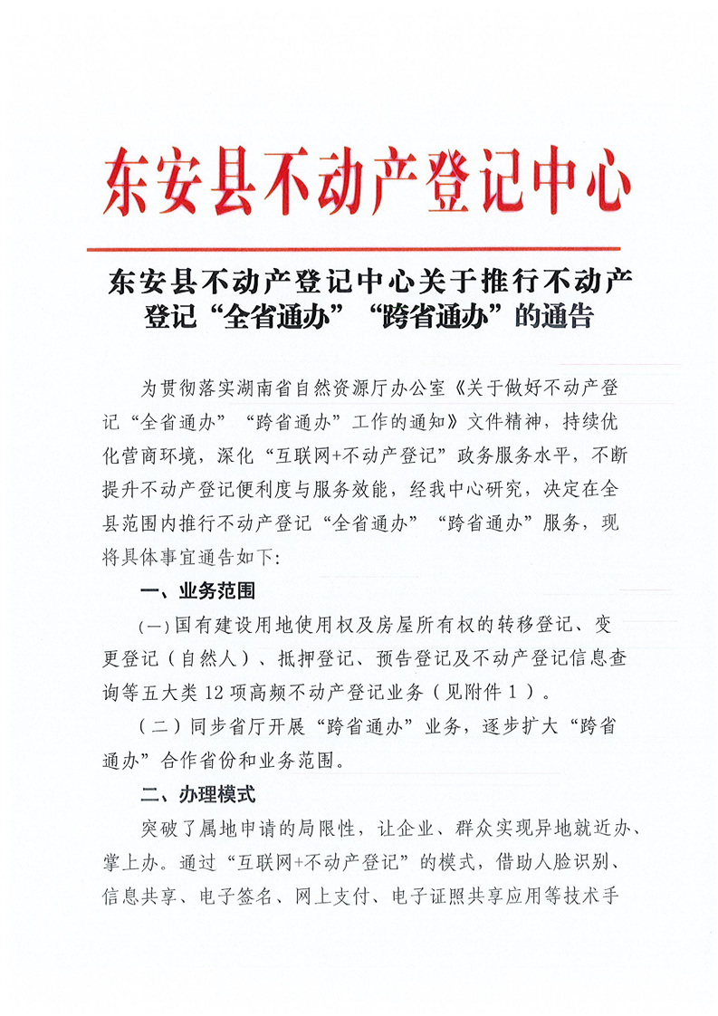 东安县不动产登记中心关于推行“全省通办”“跨省通办”的通告