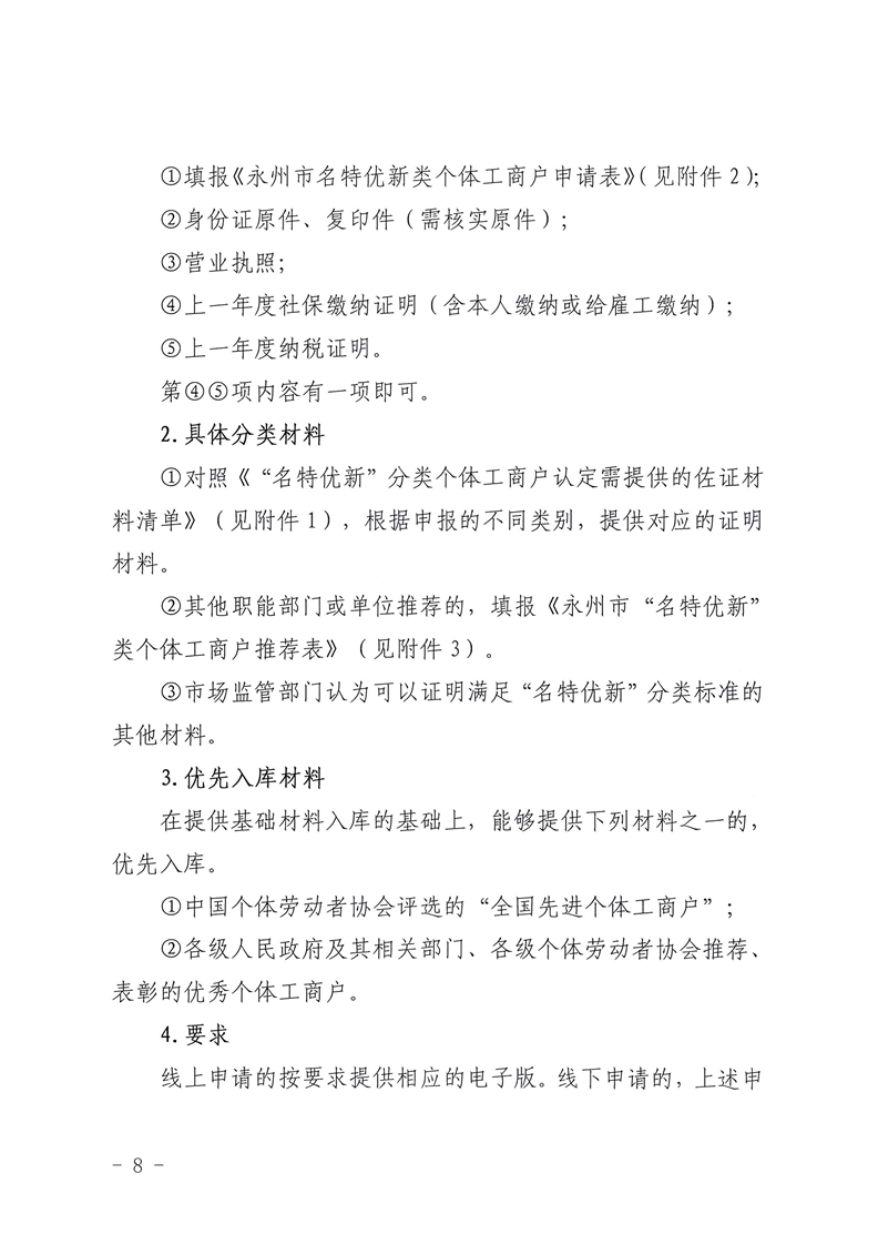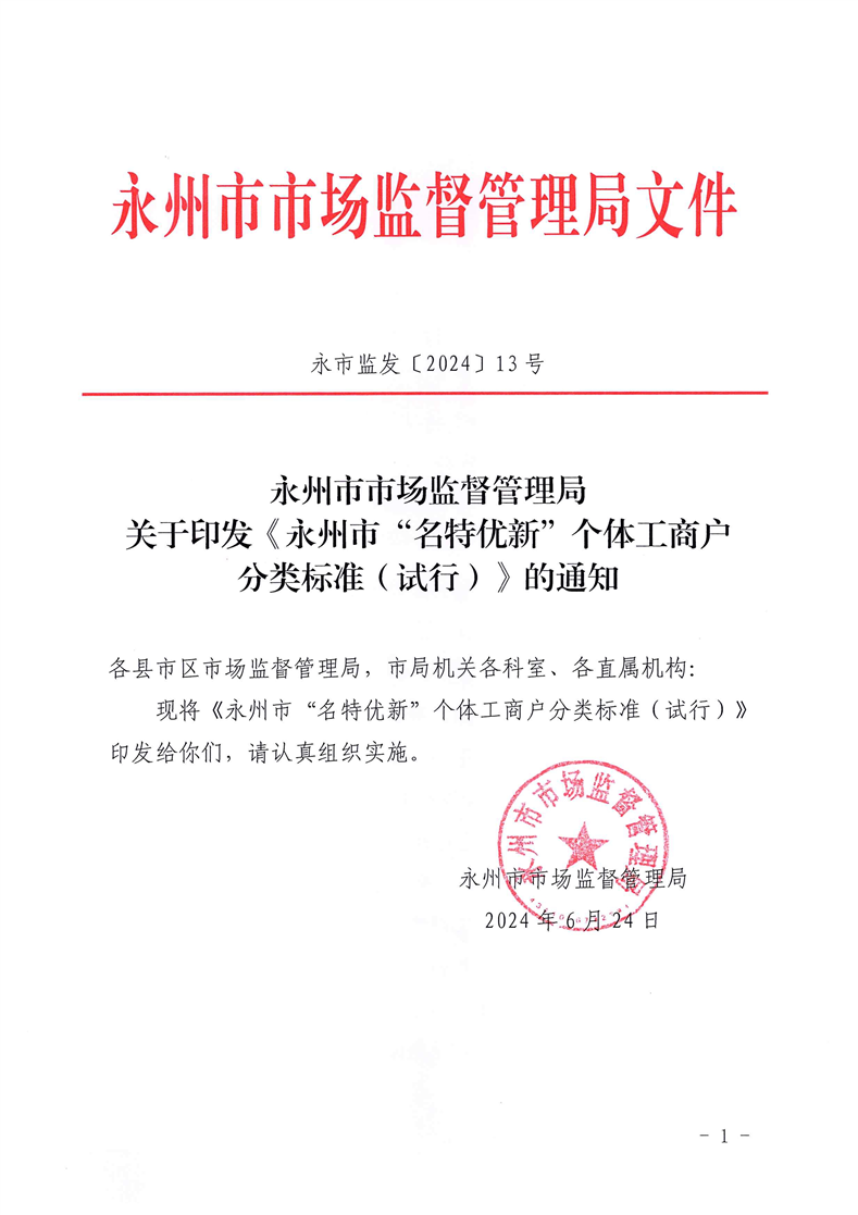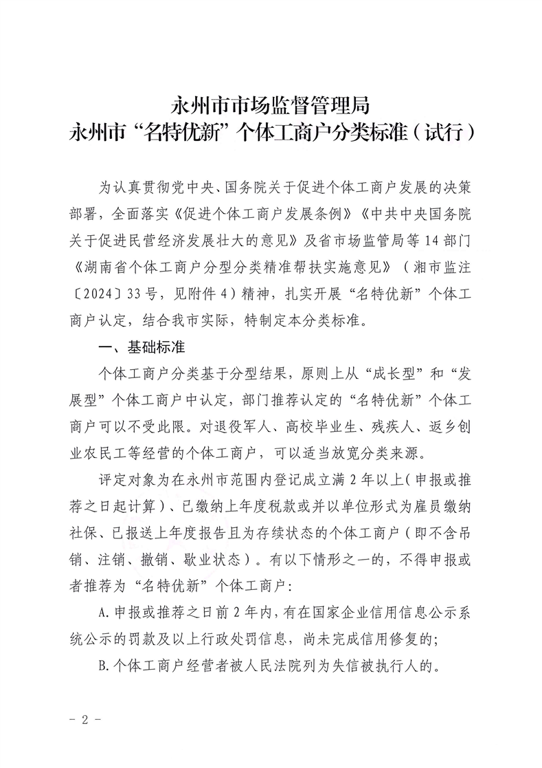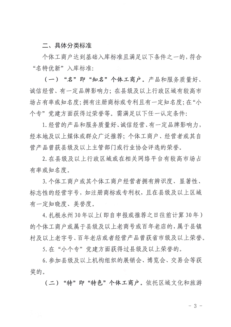 关于印发《永州市“名特优新》个体工商户分类标准(试行)》的通知