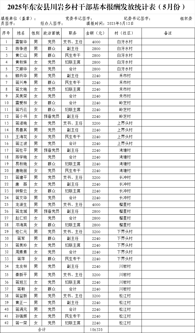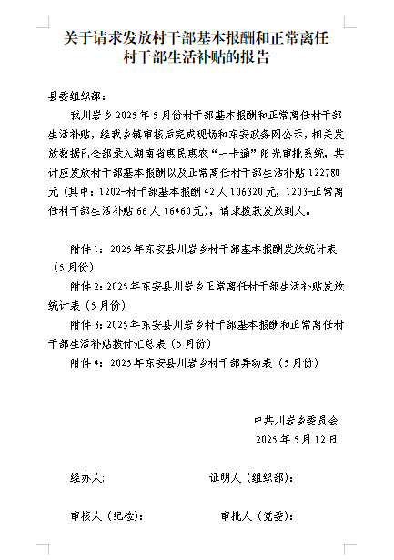 名称: 川岩乡2025年在职村干部和离任村干部5月份工资公示