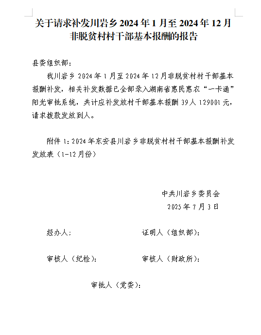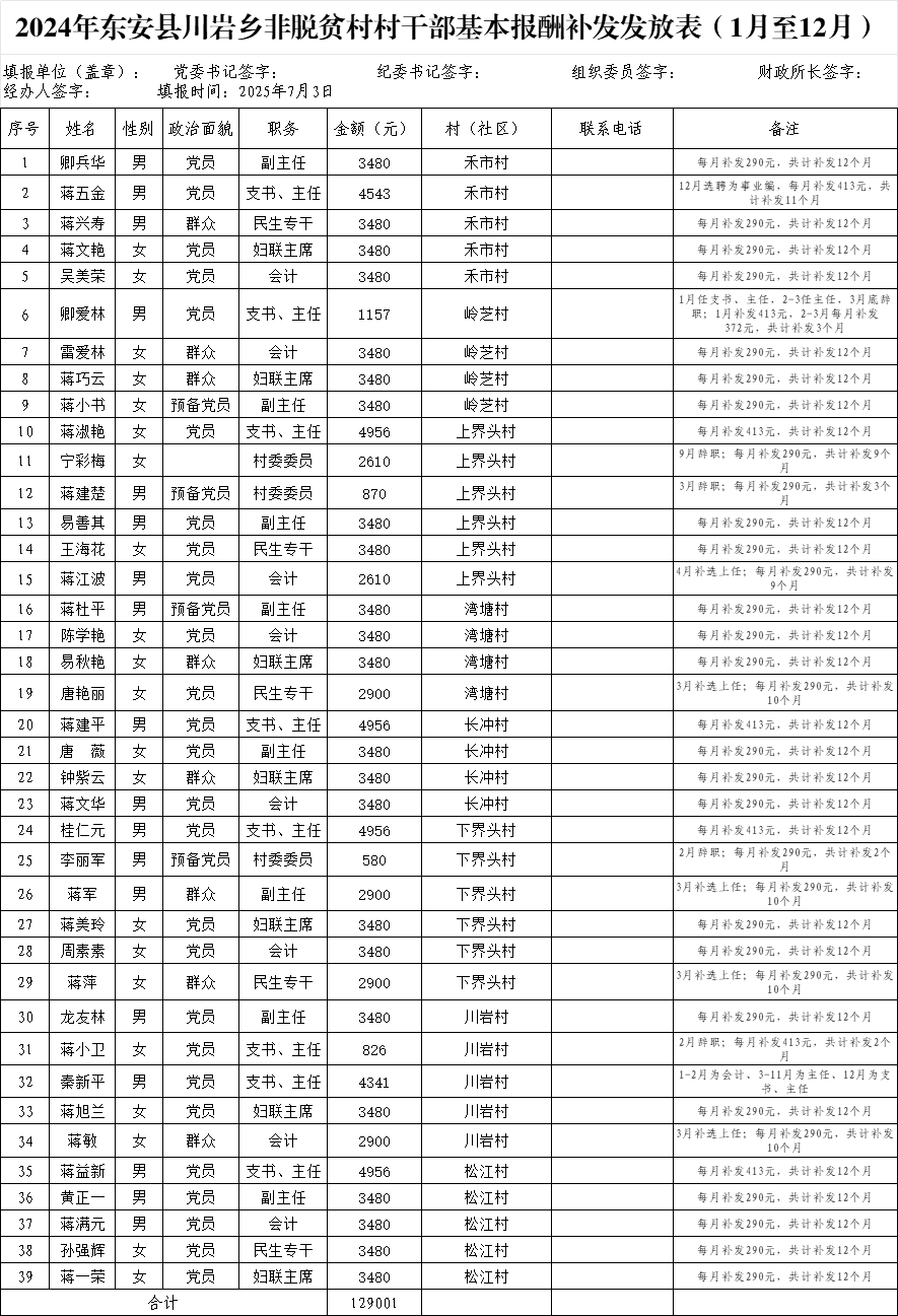 名称: 川岩乡2024年1月至2024年12月非脱贫村村干部补发工资公示