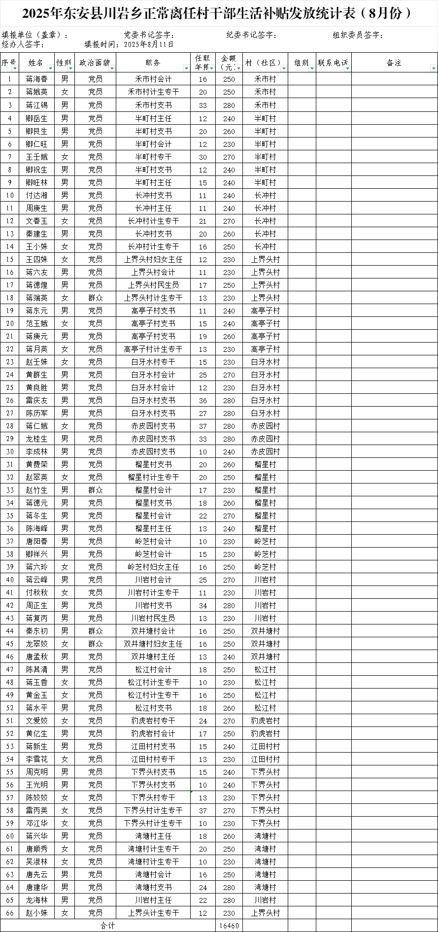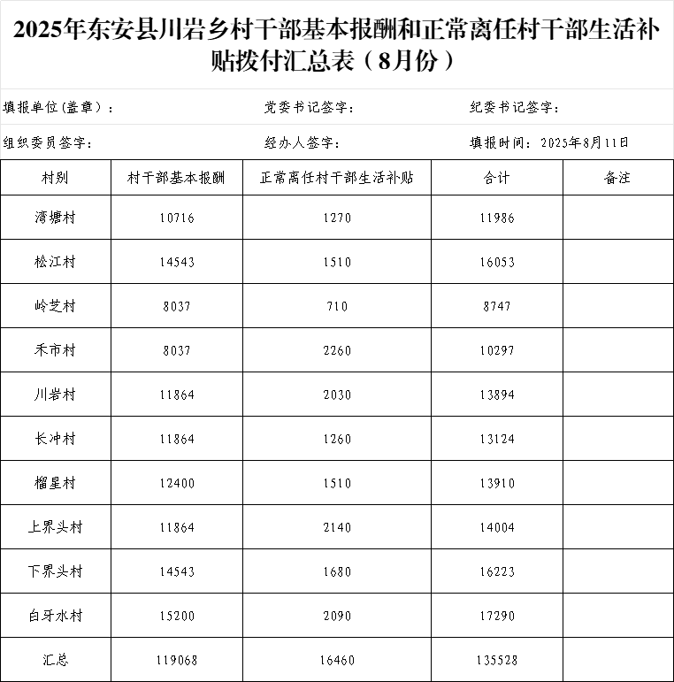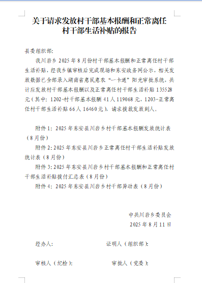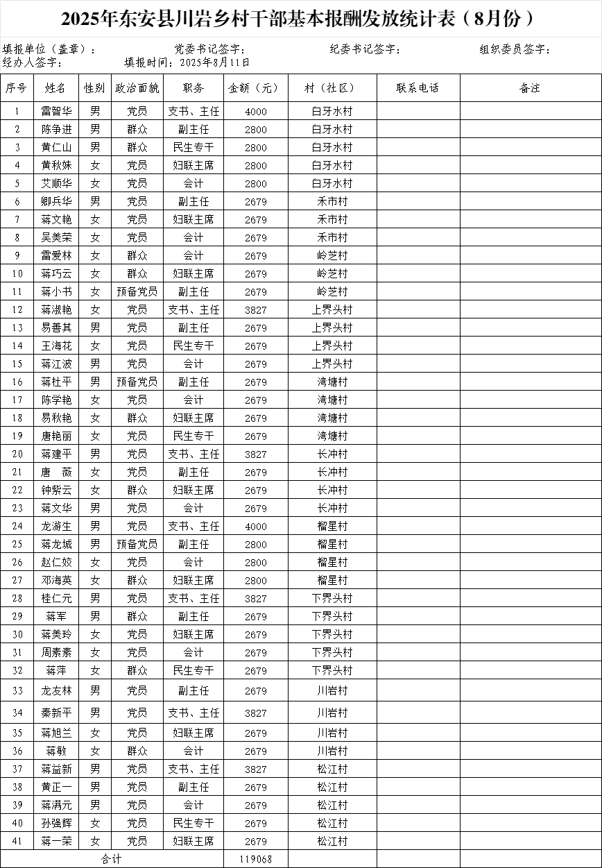 川岩乡2025年在职村干部和离任村干部8月份工资公示