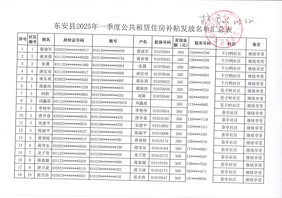 名称: 东安县2025年一季度公共租赁住房补贴发放名单