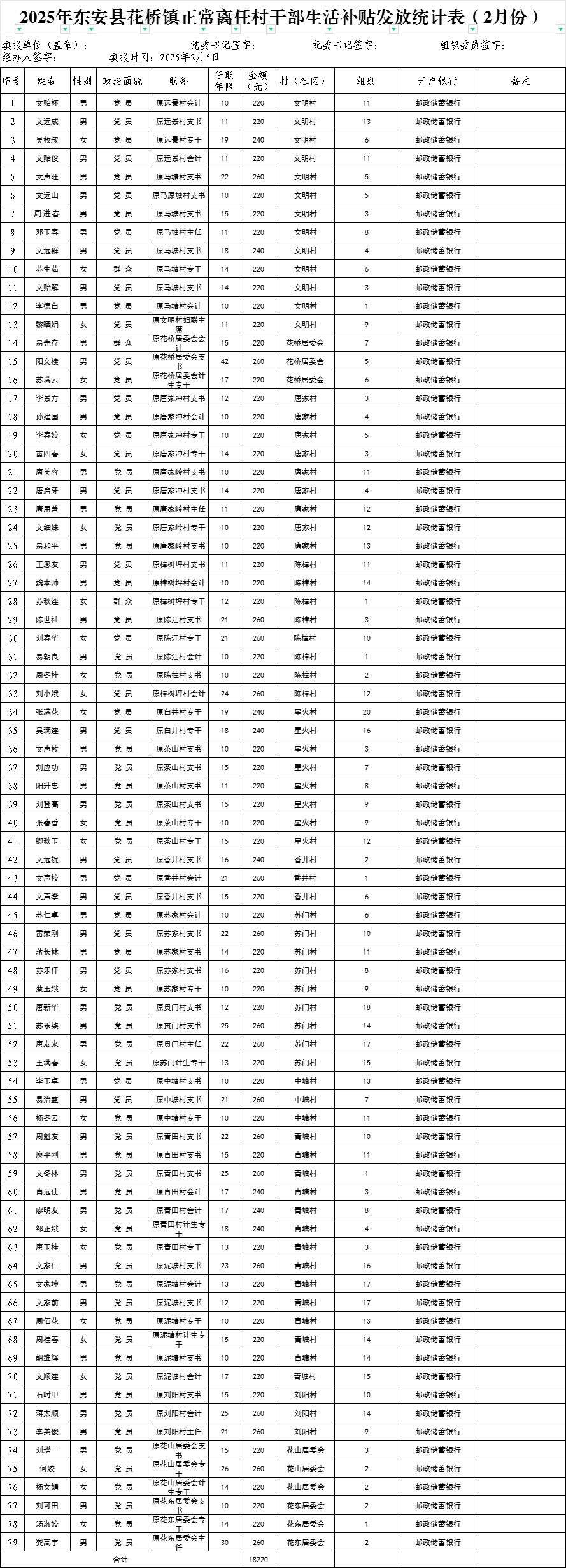 2025年东安县花桥镇村干部基本报酬发放统计表(2月份)2025年东安县花桥镇正常离任村干部生活补贴发放统计表(2月份)
