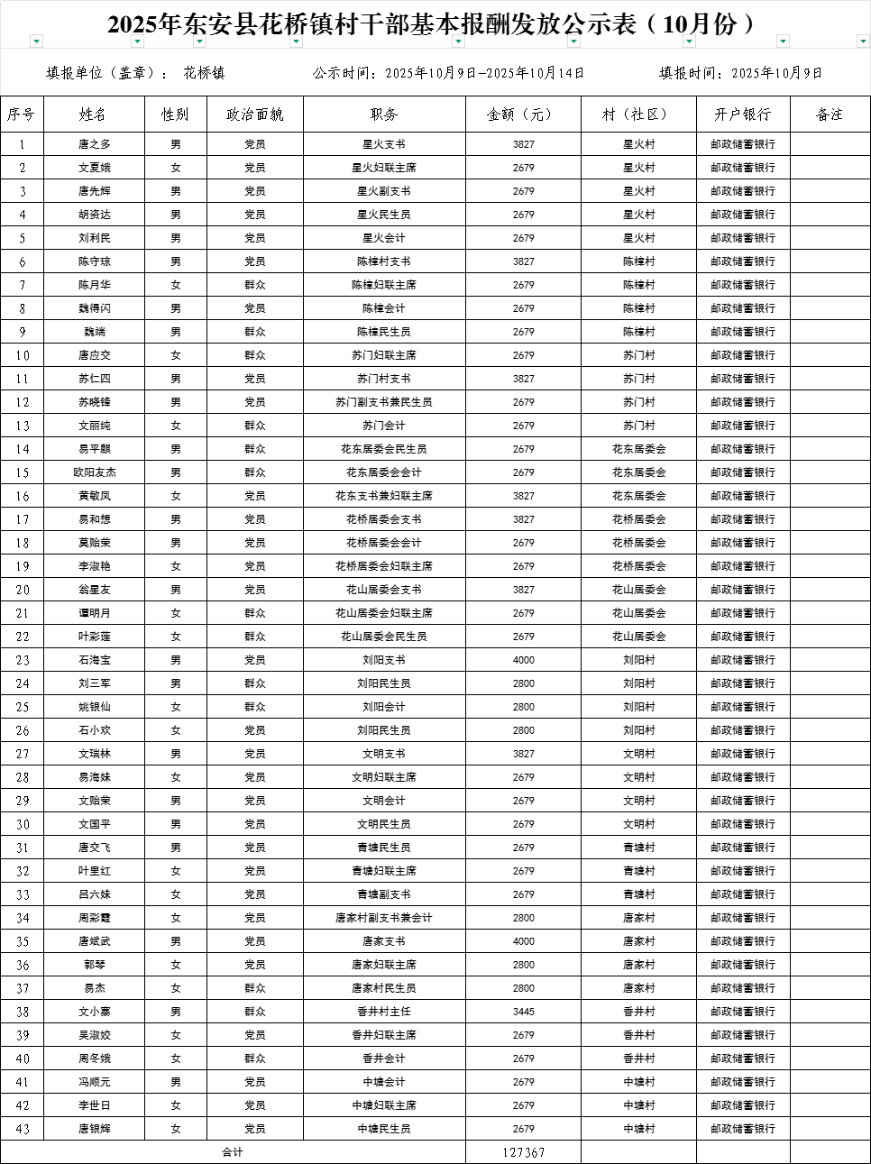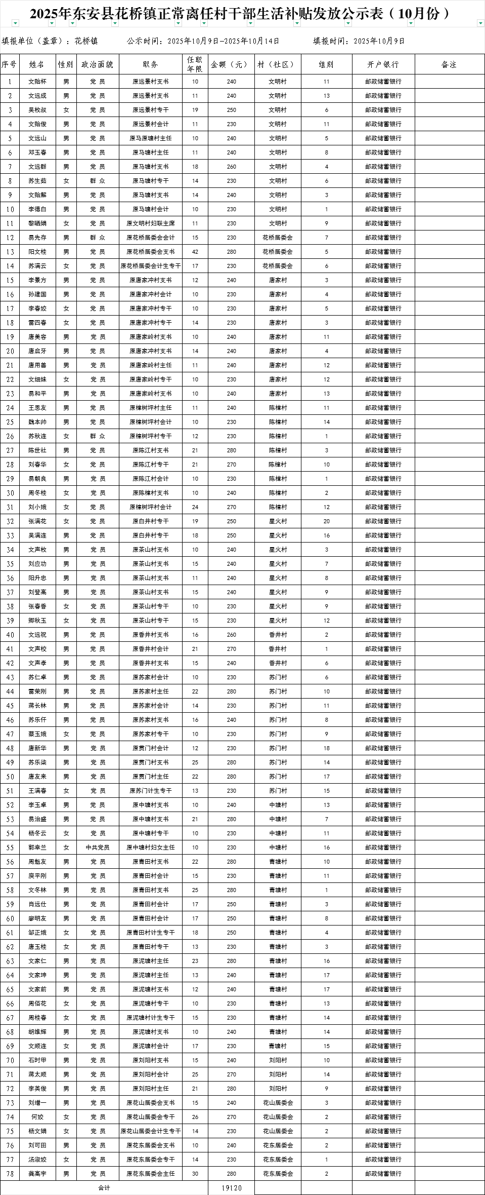 2025年10月东安县花桥镇村干部基本报酬发放公示表和正常离任村干部生活补贴发放公示表
