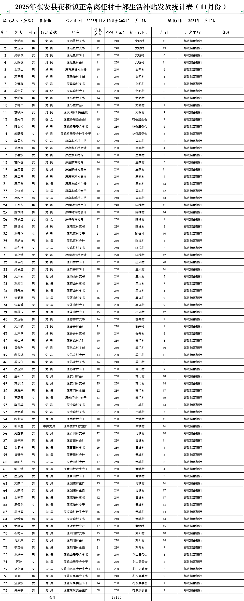 名称: 2025年11月份东安县花桥镇村干部基本报酬发放统计表、正常离任村干部生活补贴发放统计表