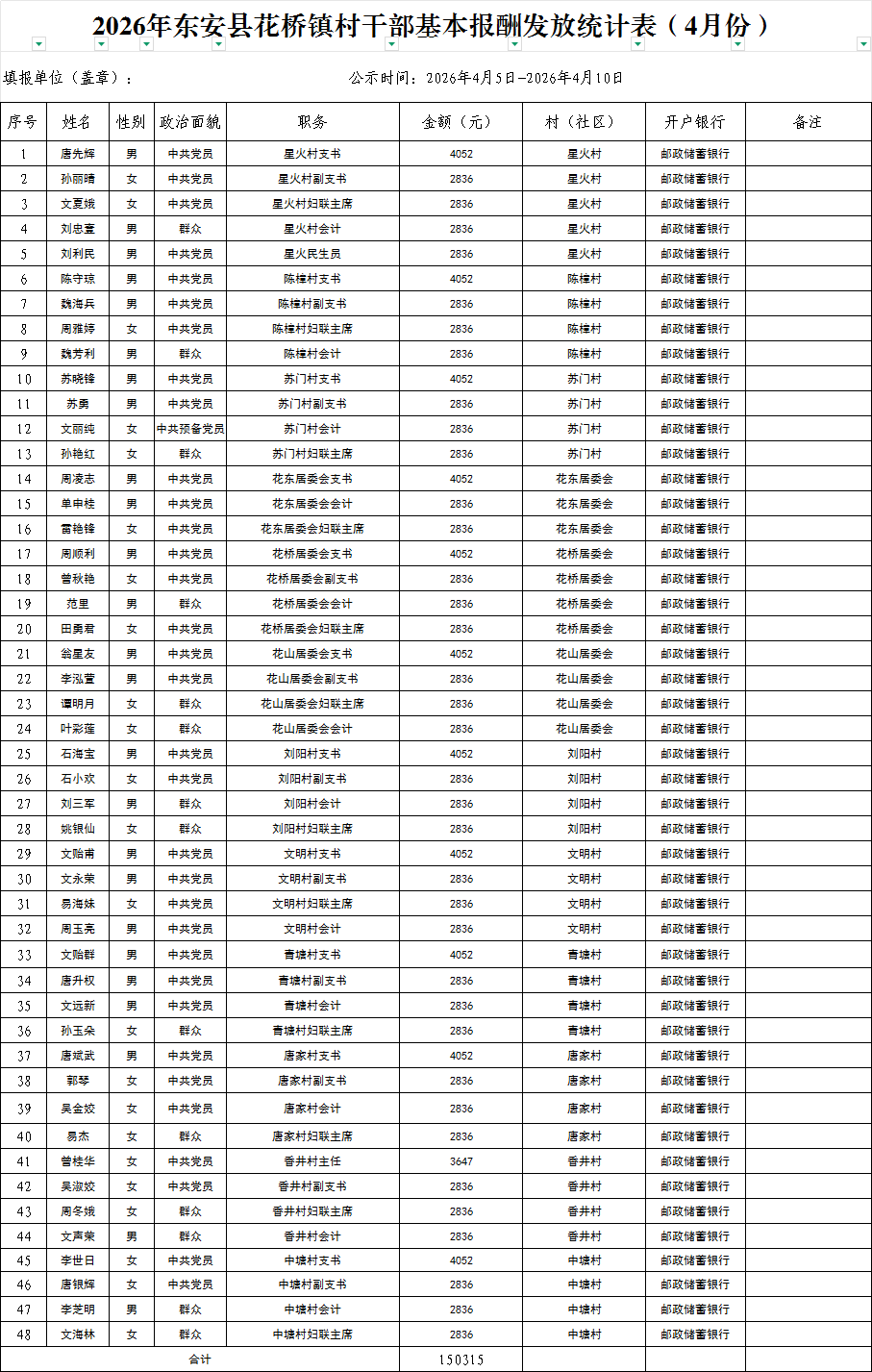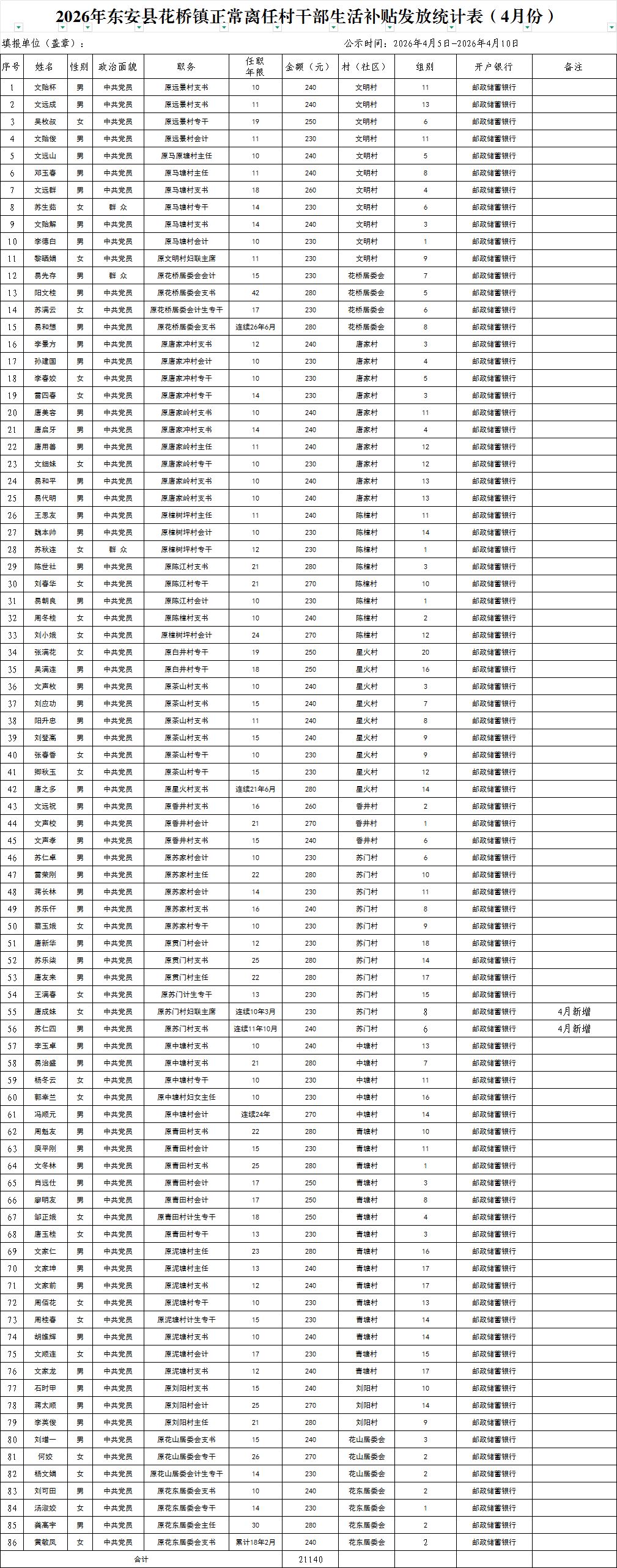 名称: 2026年4月东安县花桥镇村干部基本报酬发放统计表和正常离任村干部生活补贴发放统计表