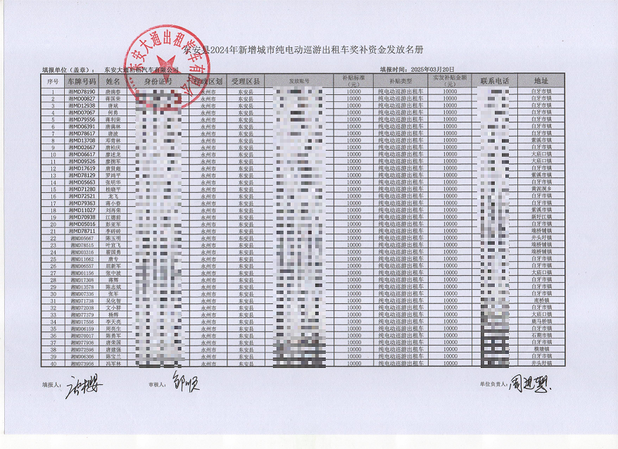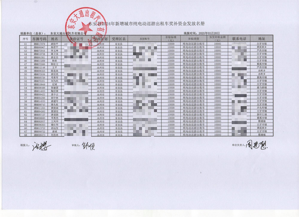 东安县2024年新增城市纯电动巡游出租车奖补资金发放表