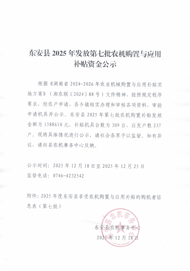 名称: 东安县2025年发放第七批农机购置与应用补贴资金的公示