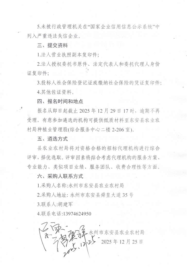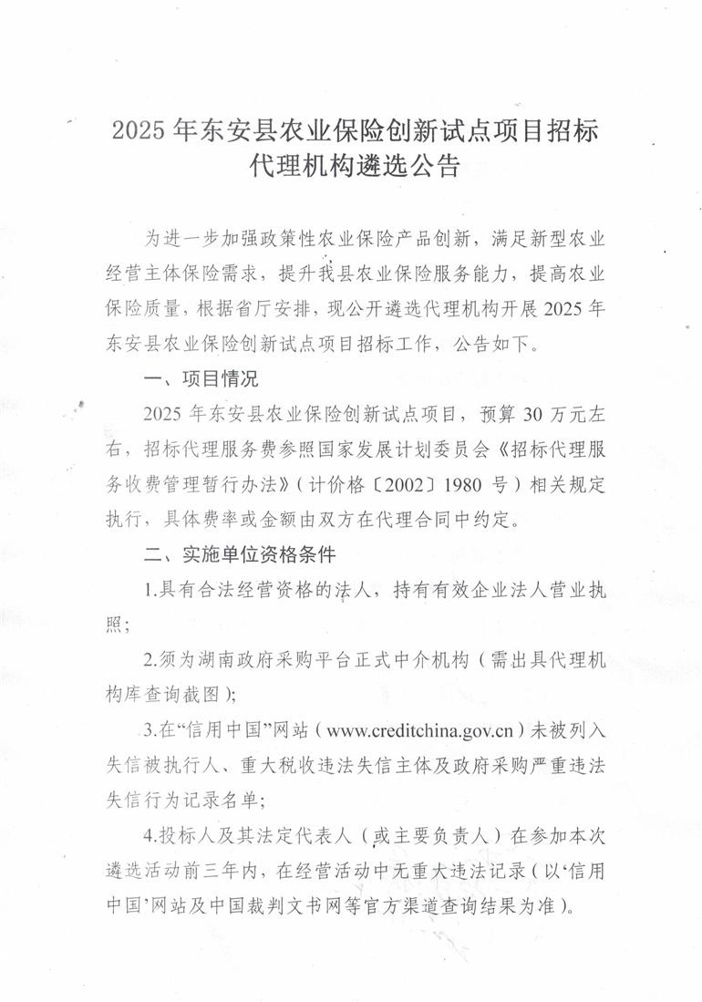 名称: 2025年东安县农业保险创新试点项目招标代理机构遴选公告